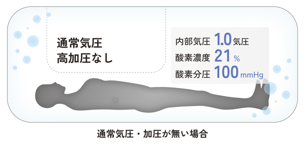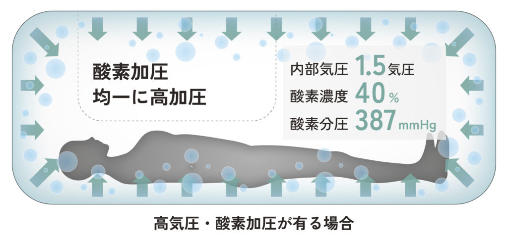 高気圧環境では、血液中に溶け込む酸素(溶存酸素)が増加し、毛細血管のすみずみまで酸素が行き渡りやすくなります。
